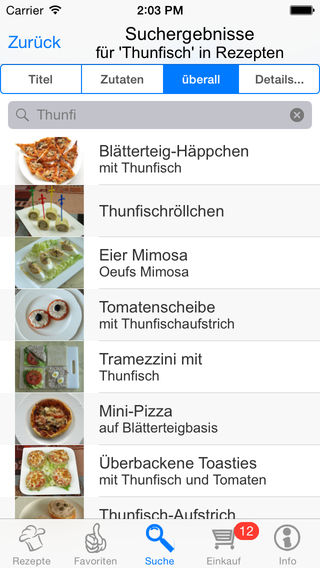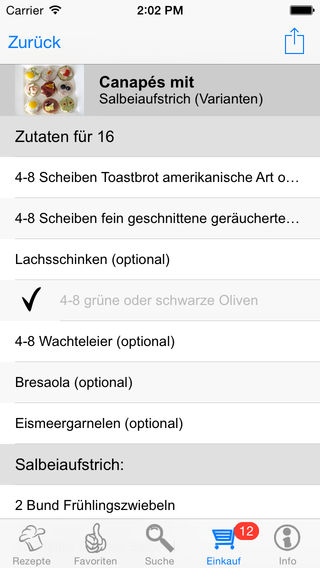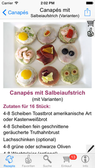 Die App für Freunde von Häppchen und Fingerfood. 236 ausgewählte und vom Autor erprobte Rezepte mit echten Bildern. Verwöhnen Sie Ihre Gäste, ihre Familie und sich mit kalten und warmen Häppchen, mit Canapés und Tramezzini, mit Röstbroten und Appetitanregern... Die Besonderheit: Alle Rezepte sind auf Ihrem iPhone als hochwertige pdf-Dateien gespeichert, jedes Rezept zum Ausdruck auf einer DIN A4 Seite optimiert, zum MITNEHMEN in die KÜCHE. Einfach per E-Mail an Sie selbst (oder an jemand anderen) schicken und drucken. Oder direkt über Air-Print fähige Geräte drucken. Funktionen im Überblick: - 236 Häppchen-Rezepte aus verschiedenen Ländern und Kategorien - Alle Rezepte mit „echtem“ Bild in hoher Auflösung, nicht „geschönt“ - Rezeptauswahl nach detaillierten Kategorien und nach Regionen - Effektive Suche nach Begriffen im gesamten Text, bei den Zutaten oder in Titeln - ausgefeilte kombinierbare Suche nach vielfältigen Kriterien - Aufnahme von Rezepten in die Favoritenliste - Kurzanleitung im Infoteil, ausführliche Anleitung auf Support-Website - Zufallsrezept auf Klick oder durch Schütteln - Zutaten können auf Einkaufsliste mit Abhakfunktion übertragen werden - Rezepte auch ohne Internetverbindung jederzeit abrufbar, da lokal gespeichert - Rezepte und alle Listen können per E-Mail versandt oder gedruckt werden - Alle Rezepte auch als hochwertige pdfs gespeichert, für Versand und Druck - 80 besondere Rezepte aus allen Kategorien können bereits am Eingangsbildschirm durchgeblättert werden - in Suchergebnissen oder Kategorien kann von Rezept zu Rezept geblättern werden (swipen), ohne zur Auswahlliste zurückzukehren Eine ausführliche Beschreibung der Inhalte finden Sie auf www.artedy.de/support