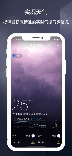 最专业最贴心的天气APP,3.8亿用户的选择,采用权威多数据源授权信息,智能纠错,国内3000多个城市与700多个景区全覆盖的天气预报和实时天气预警信息。各种天气状况从容应对,帮你做好生活决策,为你出行保驾护航。 【天气信息早知道】 分钟级预报和降雨地图——未来降水预报,精准到分钟级别。用户所在街道,每时每刻雨雪变化,尽在掌握; 逐小时预报:查看国内城市每小时天气预报、空气质量; 15日天气预报——15天预报,多天降温降雨趋势提醒,掌握更多天气信息,为出行早做计划; 天气预警提醒:实时天气预警信息第一时间掌握,由气象部门授权数据信息,精准涵盖市县区。 【污染指数见分晓】 空气质量——全方位…