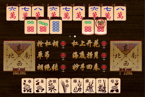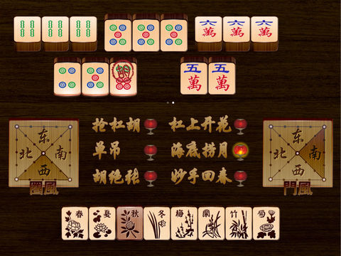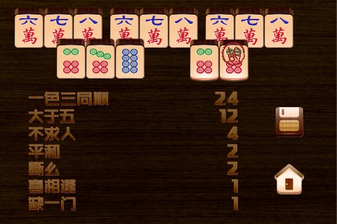 被称作“国戏”的麻将,一直受到广大群众的喜爱。但如果您是初学者,很可能会对麻将的复杂算番规则望而生畏。即使您是老手,也不见的能完整准确地算出一副牌的全部番种。“麻将计算器”可以帮您解除这方面的烦恼。“麻将计算器”根据《中国麻将竞赛规则(试行)》设计,它收录了规则中的全部81个番种,提供了直观方便的录入界面,能快速准确地计算出一手牌的得分,并可保存成图片,以便存档与分享。 操作方法: 1、用手指上下划动左下方“普通/特殊”开关,可以在“基本牌型”和“特殊牌型”间切换。基本牌型为“四副一将”型,特殊牌型分为“七对”、“十三幺”和“全不靠”型。要输入“七对”,先将“普通/特殊”开关拨到“特殊”位置,再按“对”按钮;要输入“十三幺”或“全不靠”,先将“普通/特殊”开关拨到“特殊”位置,再按“单张”按钮。 2、输入顺子,需先按下“顺”按钮,再输入顺子中最小牌。 3、明杠三张牌牌面都朝上;暗杠只有最上层的牌牌面朝上。 4、如果要输入牌面不能反映的信息,如“抢杠和”、“门风”、“花牌”等,可在键盘上横向划动,进入附加信息输入屏幕。“圈风”、“门风”按钮,每按一下,方向顺序切换一次。要返回键盘屏幕,可横向划动屏幕下半部分;要直接看计算结果,可向下划动屏幕下半部分。 5、要清空牌面,可在牌面上横向划动。 6、要指定哪张牌是“胡牌”,可双击那张牌。 7、保存的计算结果,可在本机的“照片”应用中查看。 对于本应用有任何意见或建议,可访问我们的微博http://weibo.com/mahjongcalculator。我们将陆续推出各地特色的麻将计算器,敬请关注。 感谢您使用麻将计算器!