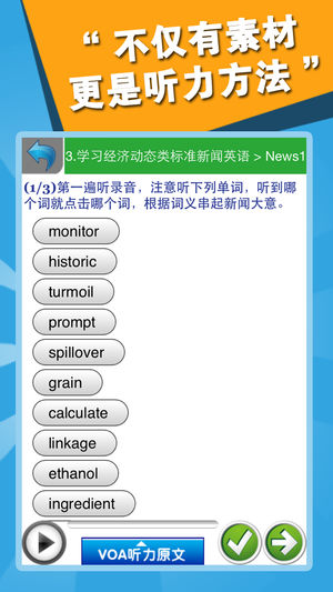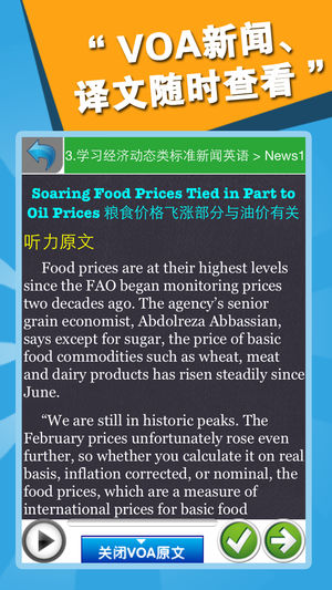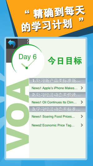 ● 史上最有效的VOA听力训练方法,配套图书正在全国新华书店热销! ● 结合艾宾浩斯遗忘曲线进行反复练习。 ● 更多学习辅助内容:新闻译文、知识点睛、听写练习。 ● 海量VOA广播级原音,石油工业出版社授权发行。 21天可以收获什么? ◎ 通过21天养成良好的VOA听力学习习惯 ◎ 听懂VOA慢速新闻英语中文化类的新闻 ◎ 听懂VOA标准新闻英语中文化类的新闻 ◎ 无障碍地收看美语发音的英文文化类电视节目 ◎ 通畅地阅读报刊杂志中短篇的文化新闻报道 21天的VOA学习怎样安排? 我们依据21天习惯养成理论,结合艾宾浩斯遗忘曲线理论,精心设计了每天的学习内容。 第一…