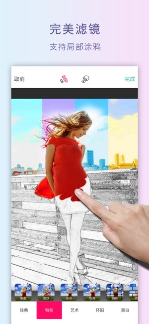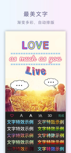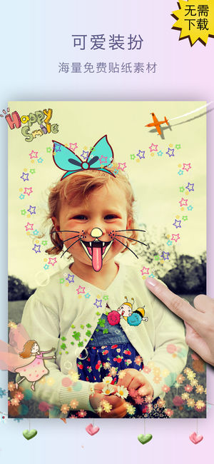 可涂鸦的贴纸,最强的文字特效,局部滤镜,百变拼图……,一款功能强大、简单易用的照片编辑软件。 ==== 产品功能 ==== 【局部滤镜】创新滤镜,支持局部涂抹,局部素描、局部油画,局部做旧,打各种马赛克、...... 【最美文字】支持自动排版,支持渐变色、多彩色,3D效果,支持描边、阴影、镂空。 【可爱贴纸】内置大量可爱贴纸,无需下载。 【指画涂鸦】提供大量可爱活泼的卡通笔刷,好玩! 【高清拼图】可选拼图比例,支持方形拼图,支持高清拼接。 【艺术相框】内置多种类型的艺术相框。 【实时调色】实时调制、混搭各种色彩参数,亮度、对比度、饱和度、色温、锐化、暗角、曝光度、色相,制作自己…
