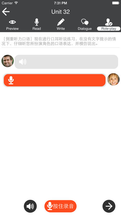 ●精选情境英语,倍增你的职场即战力! ●教你在职场中大胆开口,不再出丑! ●结合情境,不再死记单词! ------- 零基础——即学即用,带你游遍五大洲四大洋。 互动式学习——高科技语音评分系统,随时纠正发音问题。 情景式体验——模拟真实场景话题,角色扮演融入式学习。 ------- 口语不能死记硬背,兴趣才是最好的老师 互动式学习方式,完全颠覆传统的英语学习方法 不管你是“零时间,零基础,零兴趣,难坚持•••••” 从零开始,快速入门,30天流利说英语 ------ 高科技实时语音评分技术,无需联网照样识别。 智能化英语拼写练习,帮你边说、边听、边练习。 地道美语对话练习,模块化内容设置,让你轻松愉快练口语。 关于我们:| --------- 飞翼英语是国内专业的英语教育教研机构,已经出版英语学习图书近300种。我们期望能够借助一切新技术,带给您更好的学习体验。 新浪微博@飞翼英语可以解决您学习过程中的N多问题! 本课程,由外教结合英语交流实际需求、以及外教在中国多年的英语教学经验编写制作而成。是最符合中国英语学习者的口语入门课程。 本课程分为7大类共64个实用话题: --【求职面试】 Unit 1自我介绍 Unit 2提问与回答 Unit 3待遇要求 --【职场新人】 Unit 4报到上班 Unit 5介绍同事 Unit 6公司介绍 Unit 7了解工作 Unit 8同事相处 Unit 9安排日程 Unit 10电话交流 Unit 11参加会议 Unit 12请示汇报 Unit 13 请假或休假 Unit 14加班加点 Unit 15财务报销 Unit 16工作调动 Unit 17申请加薪 Unit 18办理离职 --【职场沟通】 Unit 19同事闲聊 Unit 20产生矛盾 Unit 21赔礼道歉 Unit 22表示不满 Unit 23相互帮助 Unit 24夸奖员工 Unit 25表达谢意 --【职场接待】 Unit 26机场接人 Unit 27预约来访 Unit 28邀请客户 Unit 29接待访客 Unit 30前台交流 Unit 31参观公司 Unit 32陪同观光 --【职场休闲】 Unit 33酒吧畅饮 Unit 34参加宴会 Unit 35餐桌交谈 Unit 36郊游野餐 Unit 37友谊比赛 Unit 38打高尔夫 --【职场差旅】 Unit 39办理签证 Unit 40预订机票 Unit 41机场事宜 Unit 42预订酒店 Unit 43酒店事宜 Unit 44乘坐TAXI Unit 45商务宴请 Unit 46货币兑换 Unit 47购买电子产品 Unit 48购买化妆品 --【各行各业】 Unit 49销售人员 Unit 50财务会计 Unit 51文员秘书 Unit 52外贸职员 Unit 53银行职员 Unit 54邮局职员 Unit 55餐馆职员 Unit 56宾馆职员 Unit 57教师 Unit 58图书管理员 Unit 59就医 Unit 60护士 Unit 61导游 Unit 62空姐 Unit 63海关人员 Unit 64警察