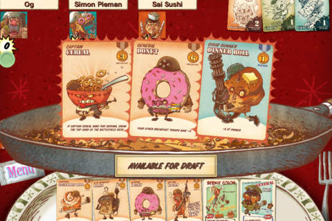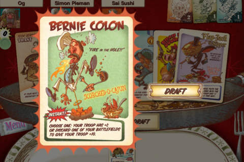 Food Fight iOS makes mobile gaming tasty! In Food Fight iOS players recruit fighting entrees and side dishes to build a battling meal for the ultimate food fight. Choose delicious and deadly entrees that will devour the competition; enlist Major Weiner and Private Pancake to team up with Mean Burrito, fortify your troops with side dishes and condiments and prepare to do battle; but beware! That sound you hear might be the Dog! And the Dog is always hungry... Food Fight iOS brings the original card game to life and featuring the original’s Draft mechanic. Food Fight iOS also presents a quicker Boot Camp mode and an innovative, iOS specific, Campaign Mode. Play against others online or via hot-seat, or against the AI in offline mode. The epic Campaign Mode let’s you battle across the land, defeating the Snack King Mascots in order to build your ultimate End Game Army. Your End Game Army had better be delicious, as you’ll soon face the dreaded Disposalor in the Under Whirled in the final battles for Breakfast, Lunch and Dinner. Play Offline •1-4 players •Hot-seat versus 1-3 others •Versus 1-3 AI players •Campaign Mode Play Online •2-4 players •Asynchronous play •Find and create online games •Player Profile to track your record Features •Instructional tutorial •Maintain and save multiple games •Boot Camp and Draft Modes •Game Center achievements in offline (non-campaign) mode Find us on Facebook and Twitter. Also by Playdek Penny Arcade The Game: Gamers vs Evil; Fluxx; Can’t Stop; Summoner Wars; Ascension: Chronicle of the Godslayer; Nightfall