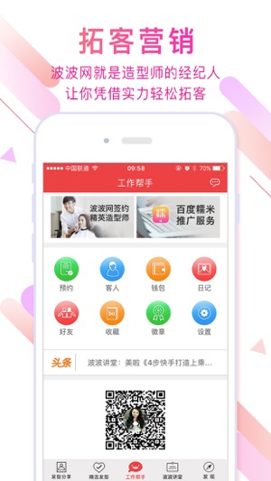 波波网是中国专业造型师手机应用。做发型师必混的圈子,会员量与活跃度在行业内已无对手。 一、让每个造型师都拥有自己的品牌 波波网就是造型师的经纪人,我们帮助精英造型师轻松完成线上、线下推广,全力打造行业新星,帮助优秀造型师拓客提升收入! 二、轻松学习,晋升职业 利用波波网可以通过低成本完成线上线下技术学习,轻松掌握技能,成为造型师中的高手! 波波网,让每个造型师都拥有自己的品牌! 了解更多波波网信息或联系客服,请关注波波网官方微信公众账号:bobo网(微信号:hairbobo1933)