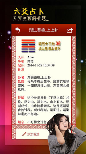 易经占卜,成就大事必备的应用程序,让您家人更健康,事业更美满! 别感叹命运不公,改善命运有秘诀! 今日运势如何?财运如何? 爱与不爱,彷徨,迷茫,犹豫,人生十字路口,如何抉择? 易经爻卦别开生面解决人生难题,阐述为人处事之道。 有人问, 易经占卜能预测甚么?它的强项在那裡?其实易经的预测范围是非常广泛的。它能预测人际配合度、天气、失物、感情、求职等等....多不胜数。 《易经》虽然深奥而神秘, 一般人难以登堂入室, 但使用本软件进行预测, 却是人人可行的。本软件通过八卦进行信息预测的科学方法, 实现了包括财运,事业,爱情,婚姻,家庭等近40多种事项占卜, 对一切做到心中有数, 有备无患,已…