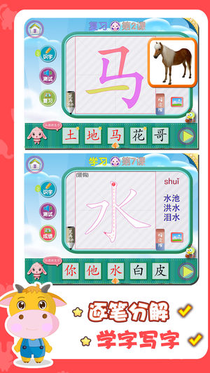 《幼儿识字》儿童学习认字的好帮手,多次获AppStore优秀产品推荐,幼儿识字是入学前孩子识字训练的神器。 *基于人教版小学语文800个基础汉字,有2500条词语,具备学字写字、认字测试、同步复习等完整的识字功能。 *有趣的激励机制,激发孩子识字兴趣,笔顺演示、描红、拼音、图片、词组、手写纠错,手把手教孩子写汉字。 *认字游戏寓教于乐,阶段复习温故知新,指定单元可反复学习测试,通过对未掌握汉字重复训练,来强化记忆。 幼儿识字,具体功能如下: 1、逐笔分解,学字写字: (1)学习认字时会有笔顺演示,并配上拼音、组词、图片和标准发音,彩色笔画分解每一笔画。 (2)手写描红时,会有笔画轨迹提示,…