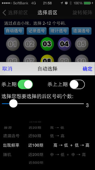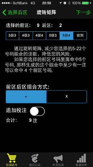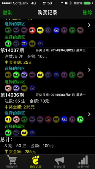 大乐透Pro 新版本已适配IOS 10。 !!! 祝贺日本彩民しゃぼん于12年3月19号使用我公司出品的ロト6プロ屋软件喜中1等奖,奖金额为217,597,800日元(约1700万人民币)。详情见产品博客。!!! !!! FarmerTech系列产品--双色球宝典Pro,2011年11月份中国生活区付费榜第二名,畅销榜第一名。2012年2月份中国工具区畅销榜第二名 !!! !!! FarmerTech系列产品--双色球宝典(普通版),2012年2月份中国财务区付费榜第二名,畅销榜第二名 !!! 本软件是体彩超级大乐透的辅助工具,集超级大乐透开奖数据分析、筛选、缩水,历史开奖结果查询,自行更新开奖号码,自动兑奖等多种功能为一体的智能化彩票软件。软件原理基于“旋转矩阵”,这一方法曾在美国造就了74位大奖得主,是彩票业主流的预测缩水算法。本软件作者为日本LOTTO6资深彩民,已在美国、欧洲、日本彩票界帮助近百万彩民用户斩获颇丰。 软件亮点: ■下一期中奖号码的预测. ■利用旋转矩阵算法帮助彩民缩水,减少垃圾投注。 ■最新中奖结果及中奖金额的更新等(数据在开奖日当天21:00分左右更新)。 ■购买记录管理,自动计算每期的中奖金额。 ■支持追加投注的奖金计算。 ■各种数据分析,分析结果均可通过邮件进行发送,发送的结果可以直接导入Excel,方便彩民的进一步分析。 ■预测结果邮件中,附件是淘宝下单用的上传文件,方便彩民进行网上投注。 ■支持模拟投注。可以利用我们的软件进行模拟投注,通过历史记录长期跟踪你的自选号码的中奖情况。 ■为了用户便于区分,软件采用了七种不同颜色来区分5红2蓝。 功能简介: 1、彩票号码的选择及购买列表的生成。 1)通过点击画面手动进行号码选择。 2)通过软件自动选择号码。 ①推荐:通过对历史开奖结果进行分析和验证, 采用特殊的计算方法排序进行选择。(例如本计算方法在对近200期的历史抽奖结果进行验证,选择11个前区号码的时候, 3个号码以上命中机率在百分之三十以上,选择3个后区号码的时候,命中一个后区号码的概率在百分之三十以上。) ②出现频率:根据10,20,50....500期数字出现的频率高低来选择预测号码,设置有高->低、低->高、高->低+低->高、中->低+中->高四个选项。 ③随机数:可以根据所选号码范围和分割数来进行随机数的选择。 3)根据购买记录来选择号码。 4)根据数据统计信息表,通过自己的判断来选择预测号码。 5)利用旋转矩阵算法帮助彩民缩水,有6种缩水类型可供选择。 5保4,5保3,4保4,4保3,3保3 缩水例:选择11个备选号码时,5/5:462注(原始组合)、5保4:22注、5保3:5注,个人推荐 5保4 或 5保3型缩水。 6)预测结果的保存及邮件的发送。 2 、购买记录的管理。 开奖后中奖金额的自动计算。 对购买次数、购买金额及中奖金额进行统计。 3、历史开奖结果查询。 4、数据统计 ◎ 期别出现次数顺序表 ◎ 期别出现次数表 ◎ 数字别出现的次数及顺序表 ◎ 数字别遗漏值,出现次数,排名表(前区) ◎ 数字别遗漏值,出现次数,排名表(后区) ◎ 低高和差数表 ◎ 奇偶数倾向表 ◎ 3、5、7、10、11、13分割倾向表示 注意事项 1、当历史开奖结果更新失败或是有错误数据发生时,请删除并重新更新。 2、如对本软件有任何宝贵意见和建议,欢迎您与FarmerTechs@Gmail.com联系! 售后QQ:2311079125. 3、本软件仅供使用者参考,因利用本应用程序购买彩票所带来的一切损失及其他后果均由使用者本人承担。