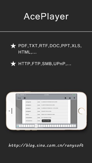 AcePlayer是一个可以播放任何格式视频、音频和相片的万能播放器,适应于iPhone/iPod/iPad.可以通过itunes或者WiFi传输文件到播放器内,也可以通过内置的客户端直接从Ftp/Samba/UPnP等服务器中打开影音文件,还做了内置的相片浏览器,可以看相片。 特征 1.支持视频格式: WMV,AVI,MKV,RMVB,RM,XVID,MP4,3GP,MPG … 2.支持音频格式: MP3,WMA,RM,ACC,OGG,APE,FLAC,FLV… 3.支持外部字幕: smi,srt,ass,ssa,sub,txt… 4.可以通过iTunes传送文件到AcePlayer. 5…