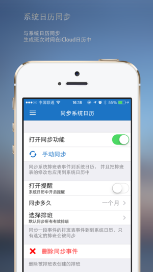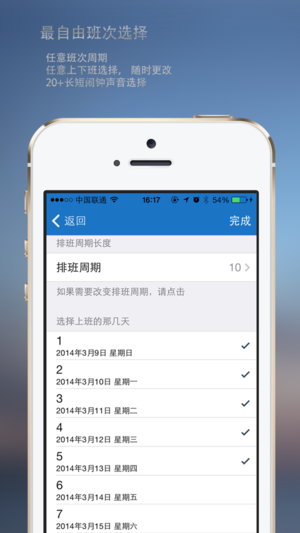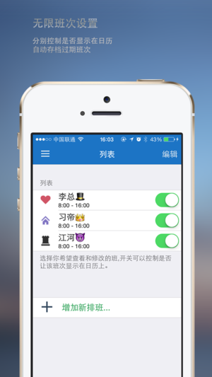 排班表一款好用的排班软件, 通过显示图标和文字到日历(支持农历)以及节假日来帮助有规律轮班的人群解决繁琐的排班问题, 让你轻松掌握你的节日,旅行,约会时刻! • (New!) 状态栏今日插件快速查看今天的排班 • 系统日历同步 • 分享微信,微博 • 完美支持农历节假日(春节,端午等), 公共假日, 以及中国,美国,加拿大,台湾,香港等国家地区的公共假日同时显示. • 增加了11种长闹钟, 你终于可以用它来作为起床闹钟了. • 自由选择排班周期, 时间,上班日期, 通过组合几乎可以排出任何需要的班, 而且非常简单. • 完美支持农历. • 提供20多种不同的闹钟声音供您选择! • 提…