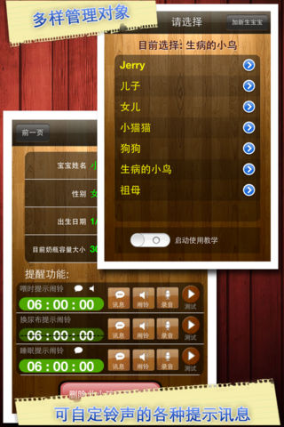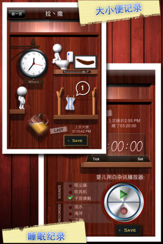 龙年得子必备App!!! 隆重介绍最火红的3.1版!它结合了宝宝吃喝拉撒睡的日志,闹铃提醒功能(可选基本闹铃声或人声),以及白噪音播放及录音器多种功能於一身之简单,完美,实用,又有趣的App! 最新功能!!! 内建宝宝白噪音播放及录音器及全新闹钟提醒功能,闹钟提醒现在开始支援两种不同的闹铃声。 荣获健康类排行第5名 - 中国。 荣获医学类排行第1名 - 阿拉伯联合酋长国, 沙特阿拉伯, 科威特, 卡塔尔, 及埃及。 荣获医学类排行第18名 - 中国 及 美国。 以及许多国家的前十名… 宝宝的开门四件事包括了吃(喝), 拉, 撒, 和睡,而这些事是新生宝宝每天一定要做的。宝贝吃喝拉撒睡试着用一种简单而轻松的方式来解决父母在记录这些事的烦恼与琐碎。换句话说, 它是设计来帮助父母管理小孩子喝奶, 大小便, 尿布使用, 以及了解睡眠长短之用。简洁有趣的使用界面可以让父母省下不少纪录的苦差事, 几个简单的触碰, 就可以迅速地记录下小孩子的吃喝拉撒睡, 父母也可以藉由汇报图表来了解孩子的每日概况和长期趋势。 只能用在新生儿吗?喔,当然不止。从婴儿到老年人,只要想记录吃喝拉撒睡相关的事,通通适用。 甚至可以用在宠物上喔! 特色: · 最新功能!!! 内建宝宝白噪音播放及录音器, 根据一些专家研究与解释,这可以用来让宝宝从烦躁不安中安静下来(类似宝宝在子宫中听到的声音)。可播放, 可录音。轻轻摇晃手机, 便可以将被覆盖的音效回复, 所以父母可以放心的不断录制喜欢的声音, 例如老奶奶的关心话, 动物园里动物讲话声, 电视里的流行音乐, 自己在浴室里唱卡拉ok的歌声, 或是任何你能想像得到的声音。轻轻摇晃手机, 便可以将被覆盖的原来音效回复, 所以父母可以放心的不断录制喜欢的声音。 · 最新功能!!! 内建闹铃提醒功能设定,以便於提醒父母定时喂食,换尿布,或睡眠。有了新生儿後,不免手忙脚乱,宝贝吃喝拉撒睡app也贴心地让父母设定喂时闹钟,换尿布闹钟,和睡眠闹钟,以便於在忙碌的生活中提醒父母这些重要的事。 · 支援盎司(oz)及毫升(cc 或 mL)。可以在新生儿档案中的目前奶瓶大小选项中改变。 · 支援管理多个小宝贝,切换也十分容易。 · 提供一步一步的使用教学模式,让你第一次使用就马上搞定。 · 内建使用图解,视讯教学(YouTube)可让父母迅速上手。 · 简单,有趣,直觉的使用方式可以让父母减少管理许多不同资料的麻烦。 · 吃喝区让父母纪录喂食开始时间,母乳或奶瓶的食用量,以及喂食时间长短。 · 拉撒区让父母纪录大小便时间,种类,以及尿片的使用数量。 · 睡眠区让父母纪录睡眠开始时间以及睡眠长短。 · 报告区让父母观看详细地记录,也让父母可以直接更改它们,父母更可以从趋势图表中,看出不同的小孩生活习惯变化(有七日,两周,一个月,三个月的图表)。 · 在记录时,上次喂食,尿布更换,或睡眠的纪录也会在同一个地方呈现(省去寻找的麻烦)。 · 支援英文,简体中文,以及繁体中文。 还在寻找笔和纸吗以便於记录您的新生宝贝的生活作息吗?当医生或护士问起何时您的宝贝有大小便而您因为记不起来而无法回答呢?不需要再伤脑筋了, 因为宝贝吃喝拉撒睡app是您最佳的帮手!!!