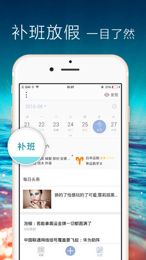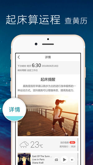 1亿国人的生活、工作必备的中文提醒类应用。下载正点闹钟,妈妈再也不用担心我每月交5000元信用卡滞纳金、家里因忘缴电费而突然停电、忘了女友生日跪搓板、错过NBA, CBA,ABA…blabla重要比赛、还有新鲜的肾卖不粗去了。。。“怕忘事,用正点”! 功能介绍 √ 法定工作日起床闹钟,让你想睡就睡不受打扰,自定义闹钟铃声和响铃界面,铃声响起时最爱的人就会叫你起床; √ 极简界面设计风格融合日历,让时间管理更加简单易用,按天、按周、按月检视自我的生活节奏,一切变得井井有条; √ 多种闹钟提醒逻辑,还信用卡(按月)、交房租(隔月)、按时吃药(一天多次)、生日管家(按年)、驾照年检(隔年)等…