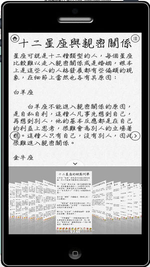 【App軟體特色】 此App適用於所有iOS裝置,只需購買一次,即可同時安裝於您自己的iPad,iPhone及iPod Touch等裝置上。 【App軟體描述】 綜合講評12星座各自的特點,並肯通過將12星座跟血型、男女、愛情、夫妻、職場、性愛、時尚的拆分對比分析,詳細披露同一星座各個血型、男女、愛情、夫妻、職場、性愛、時尚之間的不同點,讓你更瞭解自己,也更瞭解身邊的人,在為人處世中更懂得把握尺寸,做到如魚得水,避免遭小人重傷,也避免自己傷到自己。 您該摸透的12種星座情人,您該知道哪些藝人和您的情人,有一樣的星座特質和祕密?您該活用的星座速配表和星座情歌點唱祕笈,讓您用歌…