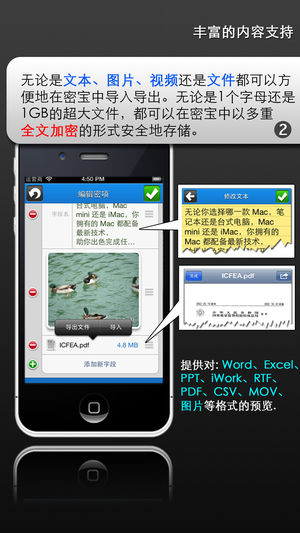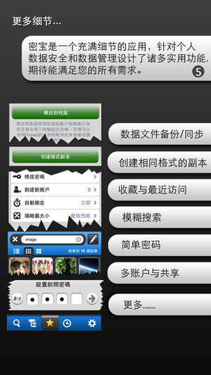 "密宝是本次测试的密码管理软件中最灵活、最好用的一款!" ,引用自德国《Mac&i》杂志2013第10期《密码管理软件评测》,此次评测中,密宝在功能和易用性两项都获得了最高分,远超第二名。 密宝致力于打造最安全的数据加密应用, 以应对任何可能破解和修改手段。通过异常复杂的多层安全设计, 确保文字、图片、视频以及任意类型的文件能够被多重保护,保证从显示到存储的绝对安全。 密宝还是一个无比灵活的应用,您几乎可以自定义一切,从混排图文内容到自定义图标和排序、再到标签式的多级目录管理, 既能提供轻松的上手体验,也能满足您的复杂应用需求。 密宝功能列表: -------------- 1. 安全…