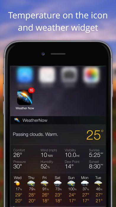 想像一下一切尽在掌握的感觉。从来没有哪一款软件能让获取天气信息变得如同“Weather Now”这般如此激动人心,更没有那一款软件的人机交互功能可以达到如此高的水平。软件中那些极其精美的3D地球图像会牢牢地抓住你的眼球,以至于让人忘记这款软件还有很多实用功能,这些功能可以用来获取精确的全球天气信息。 “Weather Now”的主要特色是其主界面和天气预报界面,其中天气预报界面有着一个独特的图表。在主界面中,你可以在选择地区后获取到一些相关信息,如当地时间,带有详细信息的天气信息,当然还有一个极其精美的3D地球图像,而这不仅仅只是个3D图像而已,它有着还原度非常高的大气云层图,甚至还有太阳和星星。你可以用手转动它,进行放大缩小操作,还可以让它自己慢慢旋转/静止。而当你将iPad放置在基座中时,这个软件还可以当作屏保老使用,绝对能吸引朋友们的目光。 天气预报信息是由CustomWeather提供的,这是一家来自美国的全球天气信息提供商,在该领域有着超过11年的经验。CustomWeather在技术和气象信息的革新方面都处于领先地位,并向世界各地的公司以及程序开发员提供气象信息。 当前天气信息是由数以千计的,经专人建造并维护的气象站采集得到的,这些气象站大多建造在各地机场中。Weather Now只显示在过去一小时内上报过当地天气信息的气象站所采集到的天气信息。当前天气信息每30分钟将更新一次,这几乎是大部分其他天气信息提供商所能达到的更新速度的2倍。而一个独特的,支持全球超过80000个地点的48小时天气预报系统,所能提供的信息详细程度与覆盖率,更是只有独此一家。 当前天气信息包括以下内容:描述信息,空气温度,风力及风向,湿度,露点温度,气压,能见度,根据当前天气情况而定的舒适度指数。 详细天气预报信息包括以下内容:描述信息,白天及夜晚空气温度,风力及风向,湿度,紫外线指数,降水概率,根据当前天气情况而定的舒适度指数。 特色功能: •可以方便的根据国旗在城市列表中选择不同的城市 •精美的3D主界面,带有高质量的实时地球图像,大气云层图像,以及太阳和星星的图像 •快速启动 •优化软件以适应iOS界面 •15日天气预报图表,带有每日详细天气信息,独立的白天及夜晚温度图表 •48小时天气预报图表,会根据实时相信天气信息变化 •提供超过80000个城市的天气信息,可以方便的查找各地信息