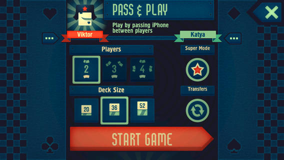 In Soviet Russia cards play YOU! Durak is a famous Russian card game. The goal of the game is to get rid of your cards before your opponents. There's an element of luck, a good bit of strategy and a ton of fun to be had. Play against the computer or your friends, online, via Bluetooth, or on the same device by passing it back and forth in the Pass & Play mode. ► Beautiful cards, sweet graphics ► Awesome sounds effects ► Fast paced, explosive action ► Online Multiplayer - play against other players online ► GameCenter Multiplayer - play with GameCenter friends or other matched players ► Bluetooth Multiplayer - two players on two devices ► Pass & Play - two player game on the same device ► Push Notifications - be notified when Internet games are created ► Game Stats - keeps tracks of wins, losses, 1st place and more ► How to Play - tutorial playthrough mode for beginners ► 20, 36 or 52 card deck, option to turn off transfers ► Completely original Special Super Mode with 8 special Supercards! ► English and Russian languages ► Chat and play at the same time ► Adjust game settings while in-game ► Smart hints - show which cards can be used in current situation ► Drag cards or tap and select - two ways to interact with cards