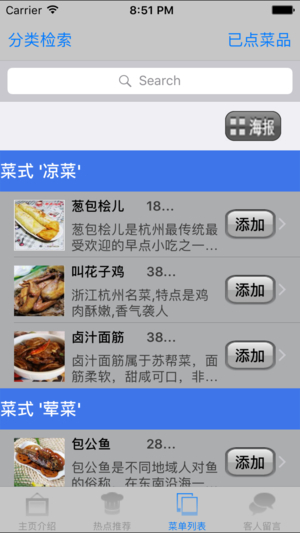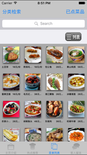 电子菜谱是一款时尚、环保的自主点菜系统,应用于iPad(iPhone/iPod),为店家带来全新的菜单管理方式,为食客带来超酷的点菜下单体验。 【更节省】随时修改菜单,不用重新编辑,不需重新打印;一次投资,终身受益。 【更全面】菜系、材料、做法、价格、图片……全方位多手段展现菜品信息,不需担心印刷版面不够。 【更吸引】点菜界面炫丽、动感,内容丰富、操作简单,自助点菜,互动性强。 还提供首页插入广告、营业数据分析、食客评价反馈、菜品模糊检索等功能。 快速提升饭店形象,拉高饭店档次,是传统纸质菜单/手持点菜系统的完美替代产品。 ▲ 给您不同的点菜体验,让点菜成为一种享受 ▲ 支持导航与查找功能,…