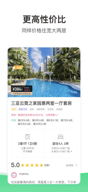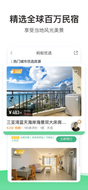 旅游出行,住民宿,选蚂蚁短租 「蚂蚁短租」是国内具有影响力的短租民宿预订平台;全球百万套精选优质民宿房源,带你任性睡遍全世界! 无论是家庭出游、境外探索、商旅出差、聚会轰趴、长租,总会有您中意的! 无论是冰雪王国哈尔滨、暖冬圣地三亚,又或是去东南亚玩转海岛,都有当地特色民宿等你入住~ 在这里,你将获得: 【更高性价比】用更实惠的价格,享受更舒适空间大的房子,物超所值,更有千元礼包来就送! 【更安全卫生】芝麻信用、房屋房客实名制、平台保险重认证!智能门锁,房屋一客一扫无死角! 【差旅报销更顺畅】在线申请发票,省时省力,节约成本,便捷高效; 【真实便捷】蚂蚁短租认证房源,全部实房实拍,可洗衣做饭…