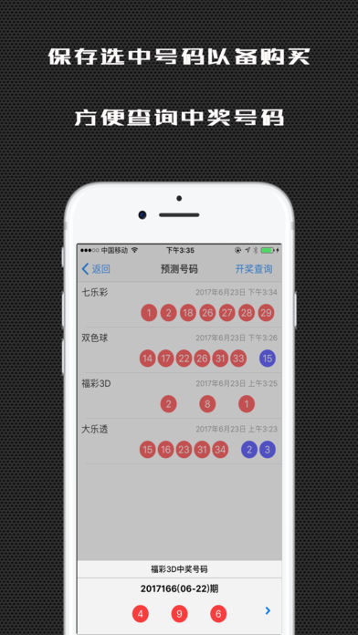 已经服务上百万彩民的智能助手重装上阵,用人工智能提升您的中奖几率! 彩民智能助手是一款帮助您选择彩票号码的手机APP,在同类应用中一直位于榜单前列。经过一年多的打磨,在2.0版本发布五个人工智能驱动的预测引擎,帮助您找到中奖率更高的彩票号码组合: 1. 深蓝引擎-基于传统的中奖号码出现次数概率统计做出预测。 2. 诸葛引擎-基于深度学习方法对历史中奖号码的分析和预测。 准确度提升+ 3. 阿尔法引擎-结合了1和2两种方法的智能预测引擎。 准确度提升++ 4. 银河引擎-结合了深度学习方法和物理碰撞模拟的预测引擎。 准确度提升+++ 5. 无极引擎- 结合1、2、3、4几种方法的综合引擎。 准确度提升+++++ 希望我们引以为豪的智能预测功能能帮您实现中大奖的愿望! 智能助手支持国内最主流的五个彩种:双色球/大乐透/七乐彩/福彩3D/排列三,您可以: 1. 保存智能引擎为您预测的号码,方便在投注站购买。 2. 用APP随时查询各彩种的中奖号码。 3. 通过微信、QQ、微博分享智能引擎帮您挑选的号码,让朋友们的点赞给您带来好运气! 祝您天天好心情,快快中大奖!