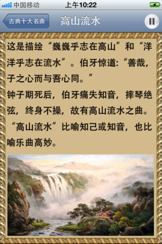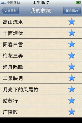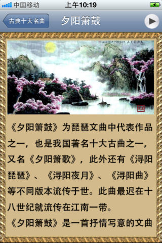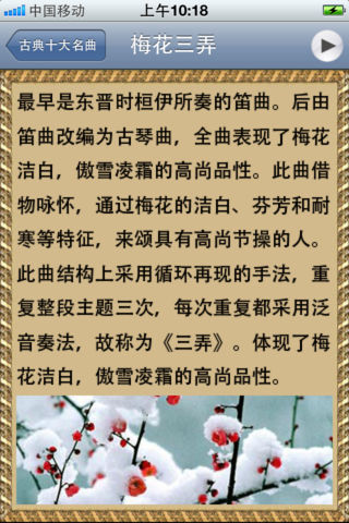 **************************************** 中国音乐分区: top 3 **************************************** 精心整理的高品质中国经典名曲。 每首乐曲都配上了制作精美的乐曲鉴赏页面。让您在欣赏美妙音乐的同时又可以增加对中国传统名曲的了解,相信您一定会喜欢。 APP支持后台播放。 同时支持iPhone和iPad 专门为iPhone和iPad设计了不同的界面. 主要乐曲包括: 1. 古典十大名曲: 高山流水 梅花三弄 夕阳箫鼓 汉宫秋月 阳春白雪 渔樵问答 胡笳十八拍 广陵散 平沙落雁 十面埋伏 2. 古筝十大名曲: 寒鸦戏水 出水莲 渔舟唱晚 东海渔歌 高山流水 柳青娘 林冲夜奔 秦桑曲 香山射鼓 战台风 3. 琵琶十大名曲: 十面埋伏 海青拿天鹅 霸王卸甲 塞上曲 月儿高 夕阳箫鼓 阳春白雪 大浪淘沙 灯月交辉 醉归曲 4. 二胡十大名曲: 二泉映月 良宵 听松 空山鸟语 寒春风曲 月夜 流波曲 病中吟 三宝佛 光明行 5. 葫芦丝十大名曲: 月光下的凤尾竹 有一个美丽的地方 多情的巴乌 侗乡之夜 竹楼情歌 花楼恋歌 蝴蝶泉边 渔歌 月夜 婚誓 6. 笛子十大名曲: 姑苏行 早晨 荫中鸟 五梆子 今昔 秋湖月夜 鹧鸪飞 霓裳曲 喜相逢 牧民新歌 7. 洞箫十大名曲 春江花月夜 清明上河图 平湖秋月 彩云追月 苏武牧羊 阳关三叠 昭君怨 汉江韵 茉莉花 梁祝 8. 唢呐十大名曲 百鸟朝凤 凤阳春 打枣 一枝花 喜迎春 婚礼曲 山东大鼓 山村来了售货员 抬花轿 正月十五闹雪灯 9. 其他十大名曲: 春江花月夜 金蛇狂舞 紫竹调 彩云追月 苏武牧羊 阳关三叠 昭君怨 汉江韵 茉莉花 梁祝 后续更新计划: 1。增加更多中国古典乐曲 2。增加更多的乐曲的文字介绍 3。如果您有额外需要,可以发邮件给我们:ibollo.com@gmail.com, 我们一定会尽力增加.