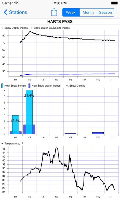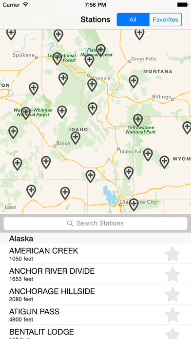Snow Tell provides real time access to over 800 weather stations around the Western US, from the Snotel network. All stations include snow depth, density and temperature information. Number of stations: Alaska: 64 Arizona: 23 California: 33 Colorado: 115 Idaho: 85 Montana: 102 New Mexico: 28 Nevada: 55 Oregon: 82 South Dakota: 3 Utah: 112 Washington: 73 Wyoming: 90