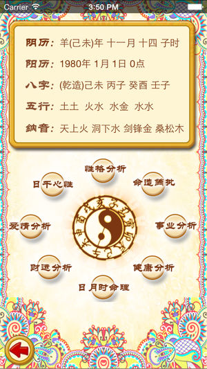 生辰八字,是周易术语四柱的另一种说法。四柱是指人出生的时间、即年、月、日、时。在人用天干和地支各出一字相配合分别来表示年、月、日、时,如甲子年、丙申月、辛丑日、壬寅时等,包含了一个人出生时的天体运行的基本状态。每柱两字,四柱共八字,所以算命又称“测八字”。依照天干、地支沂涵阴阳五行属性之相生、相克的关系,推测人的体咎祸福。 本算命系统来源于中国民俗学的一些测算方法,仅供休闲娱乐,请勿迷信。