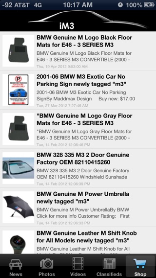 Welcome BMW M3 Enthusiasts to your one-stop iPhone app to get the latest M3 news, images, videos & shop for high quality aftermarket parts for your M3! Features: - Daily Updated News from popular BMW M3 forums and enthusiasts around the world! - High Quality BMW M3 Images. - Exciting BMW M3 Videos. - Shop for hundreds of aftermarket parts for your BMW M3. - Mark your favorite news, aftermarket parts and share via E-Mail, Twitter and Facebook. - Browse the private classifieds to buy new/used parts for your M3 sold by local people around your area. Let your voice be heard. If you would like more news, photos, videos and/or items in the store, send your request on http://www.squidoo.com/iM3