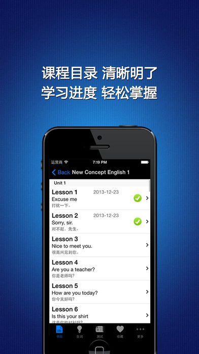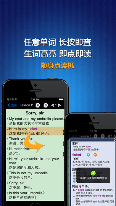 《新概念英语》(New Concept English),经典的英语学习教材。 √√标准发音+英汉对照+有声全文字典+点读机 《新概念英语》的每个句子都有标准的真人读音, 英汉对照, 即点即读. 文中每个英文单词都有详细的解释, 音标, 发音以及例句用法, 在阅读的时候只需在任意单词上长按超过一秒钟, 即可查阅, 即点即译, 真正做到哪里不懂点哪里. √√强大的学习功能 《新概念英语》提供了【生词】【收藏】【字典】【单词测试】【单词拼写】等附加功能, 可以将文中任意单词加入到【生词】, 生词在文中用【特别的颜色】标识, 把喜爱的课程加入到【收藏】, 对任意单词进行检索, 测试和拼写练习. 多种播放模式: 单句, 单句循环, 全文, 全文循环, 全书循环, 支持后台播放, 可切换英汉对照模式与纯英文模式. 新增语速调节功能, 三种语速, 任意调节. √√强大的进度管理功能 《新概念英语》提供了进度管理, 时间管理, 每本书, 每个课程, 每个生词都有学习进度, 学习时间, 精确掌控学习进度. √√智能生词库与测试题库 《新概念英语》为文中的每个单词都配备了测试题库, 【单词测试】智能选词, 频繁测试【生词】, 想记不住生词都难. 此外还配备了AppStore上唯一可以直接在文中做【完形填空】的强劲功能. √√安装后再也不需要联网 《新概念英语》完全是单机运行, 不会联网, 不用担心网络资费. √√最人性化的操作方式 《新概念英语》全文定位点读, 同步高亮显示. 长按任意单词即弹出词典, 同时可将单词加入生词列表. 不需要进度条式的拖拽, 没有查字典的繁琐. 最新支持耳机线控操作, 使用更加轻松便捷. √√iPod, iPhone, iPad通用 《新概念英语》用最科学的方法帮助您快速稳固的提升听/说/读/写各项技能, 不断挖掘您的学习潜能. √√联系我们 官方微博: http://weibo.com/u/2616259511 电子邮件: littlepipi2011@gmail.com