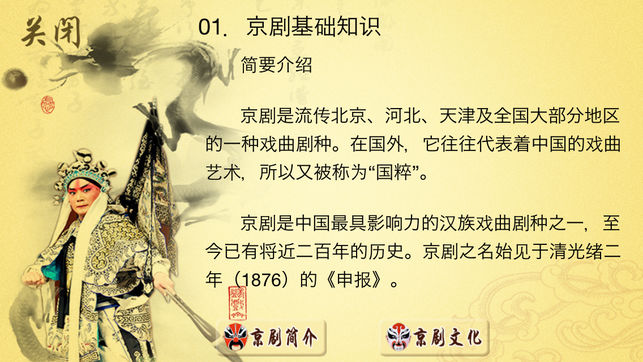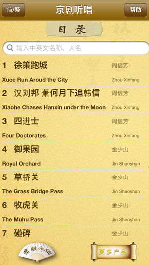 《京剧听唱》产品提供了118首由名家演唱的精彩的京剧名段,包含“原唱、清唱、我的作品”等功能,便于模仿和欣赏名家的演唱;原唱时,歌词同步显示;我的作品,便于用户管理自己演唱的京剧唱段;产品还配有京剧简介、京剧文化及名段曲目赏析。 《京剧听唱》产品,具体包含以下曲目。 徐策跑城(Xuce Run Aroud the City) 萧何月下追韩信(Xiaohe Chases Hanxin under the Moon) 四进士(Four Doctorates) 御果园(Royal Orchard)…