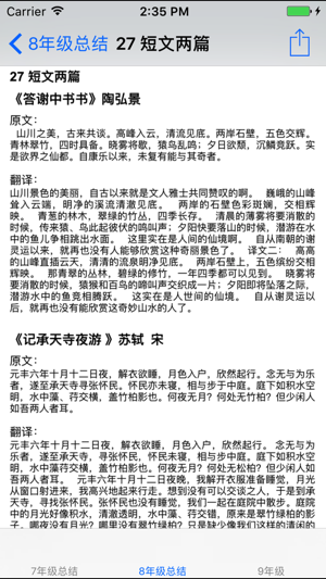 《初中文言文大全 - 翻译|背诵|练习》是一个帮助初中生朋友总结文言文知识点的好应用。 ---内容涵盖了: *初中文言文通假字总结; *初中文言文中的成语总结; *初中文言文重要语句翻译; *初中语文简答、默写复习资料汇编; *初中文言实词一词多义汇释 【内容目录】 七年级上册 - 1 - 5、《世说新语》两则 - 1 - 咏雪 - 1 - 陈太丘与友期 - 1 - 10、《论语》十二章 - 2 - 20、 虽有嘉肴 - 3 - 25、河中石兽 纪昀 - 3 - 30 寓言四则 - 4 - 智子疑邻 - 4 - 塞翁失马 - 5 - 七年级下册 - 5 - 5、《伤仲永》…