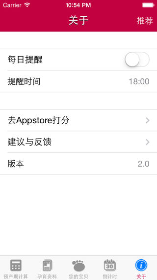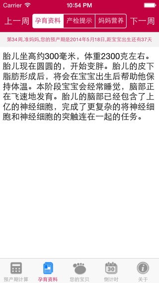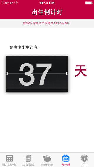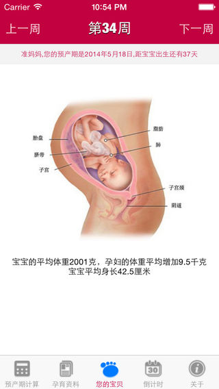 √ 支持语音播报 预产期计算器可以帮你比较准确掌握宝宝的出生日期,但是只有5%的宝宝会正好在预产期那天出生。 【预产期计算器功能】 1、根据末次月经和月经周期计算您的预产期 2、孕育资料 详细描述婴儿的发育状态,让您对婴儿的发育成长了如指掌。 3、产检提示 提醒本周期您要做的产检事项。 4、妈妈营养 婴儿的健康发育是准妈妈最看重的事情,妈妈营养详细描述了婴儿茁壮发育的营养资料。 5、您的宝贝 用权威的图示讲解婴儿当前阶段的发育状态。 6、出生倒计时 为心怀激动的准爸爸、准妈妈清晰的提示还有多少天宝宝就出生了。 7、关于 可以设置每天提醒功能,每天定时提示您。