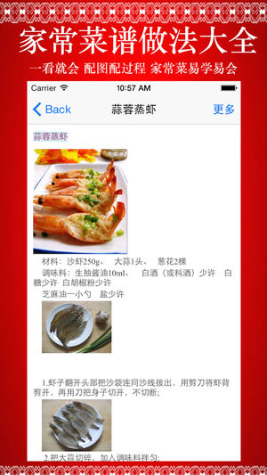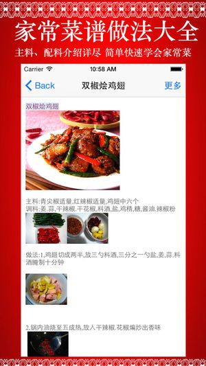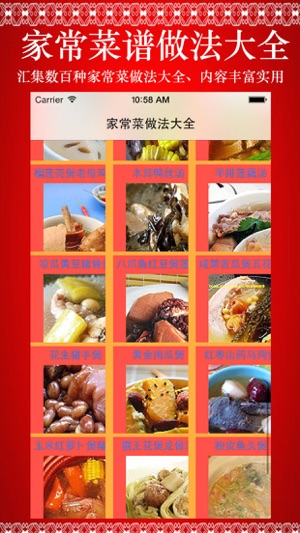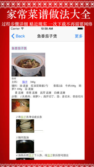 *****一学就会的家常菜 给力推荐《家常菜谱做法大全》***** -----图文并茂介绍了近百款家常菜谱的做饭,原料、辅料、制作过程,成品截图,口味、特色等等; -----应用十分适合喜爱家庭烹饪的认识参考学习; ~~~新浪微博:http://weibo.com/u/5479649208 ~~~QQ群:370105102 ====内容包括了: 拔丝山药",@"家常炒饼丝",@"鼓香平子鱼",@"茄汁虾球",@"沙滩鲫鱼",@"双椒烩鸡翅",@"农家小炒肉",@"蒜蓉蒸虾",@"双椒茭白丝",@"豉椒爆炒贝",@"翡翠冬瓜虾",@"红烧带鱼",@"香爆西湖螺",@"芋头红烧肉",@"芹系龙灯"…