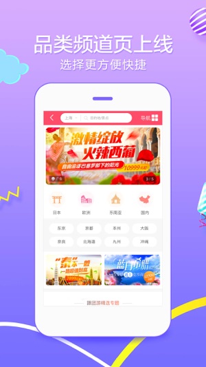 热门跟团游:出境游、国内游、周边游以及同城旅游应有尽有,无需旅游攻略,一站轻松搞定,让你省钱又省心。 缤纷主题游:蜜月游、亲子游、家庭游,花样主题给你精彩体验;多人同程旅游,团队定制满足多方个性化需求。 人气自由行:机票、酒店、景点门票、签证、当地跟团游、自驾游一应俱全,你也可以是旅游达人。 经典邮轮游:皇家加勒比、歌诗达等全球知名邮轮预订,助力您的航海梦想,带来舒适奢华的游乐体验,海上美景一览无遗,带你“邮”遍全球。 旅游特卖惠:限时特卖惠,为热爱旅行的你带去惊喜!不必穷游,下一站去哪儿由你决定!