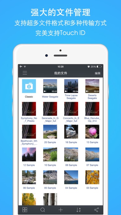 - 超过两百万用户选择FileHub管理自己的文件。 > 完美支持iOS9多任务 > 强大的流媒体播放器,直接从各种云存储、FTP/SMB远程主机在线浏览照片,播放音视频资源。 > 无线传输已完美支持Google Chrome、Safari、Firefox以及IE、360、腾讯、搜狗等主流浏览器,专业的WEB管理控制台轻松秒杀同类软件。 这是一款功能强大、界面直观易用的iOS文件管理器,存储、浏览、阅读、分享文件的好帮手,帮助您轻松管理本地、云端以及远程电脑上的文件。应用内置专业的PDF/TXT 阅读器、照片查看器以及音乐和视频播放器,轻松满足您日常工作和娱乐需求。如果您厌烦了在小小的设备上管理文件,那么应用内的无线传输功能使您可以在Mac/PC端用浏览器来上传、下载甚至管理您iOS设备上的文件。 > 主要功能 - 密码保护 • 支持简单密码和复杂密码 • 打开、关闭密码保护 - 文件管理 • 目录管理 • 密码保护目录 • 支持简单列表、详细列表和图标三种浏览模式 • 提供强大的文件深度搜索 • 强大的缩略图系统 • 您可以新建目录、改名、移动、删除、压缩文件 • 支持按名字、日期、大小、类型排序 • 支持录音功能 • 支持从iPod音乐库导入音乐 • 支持从系统相册批量导入照片和视频 • 支持导出照片、视频到系统相册 • 您可以使用您喜爱的第三方应用打开任何文件 •支持创建带密码保护的ZIP文件 • 全功能解压缩模块支持解压ZIP、RAR、7-zip、CBZ、CBR、TAR、BZ2、GZ等压缩文件 • 通用文档查看器支持WORD、EXCEL、Power point、PDF、TXT、HTML、RTF和RTFD.ZIP文件 • 支持导入、导出iCloud Drive文件 - 云存储管理 • 支持iCloud, Google drive, Dropbox, Box, OneDrive, SugarSync, Copy, Yandex.disk等云存储服务. • 支持FTP,SFTP,WebDAV,Windows SMB服务. • 支持多账户管理. • 直接从相册上传照片到云端. • 查看账户基本信息, 比如: 云盘的配额、已使用空间大小等信息. • 支持目录上传、下载. • iCloud, Dropbox和Skydrive支持获取文件外链. • Dropbox, Skydrive, Baidu, Yandex.disk和WebDAV支持在线浏览PDF, 照片以及在线听音乐和看视频的功能. • Box, Google drive和SugarSync支持在线浏览PDF和照片. - TXT阅读器 • 支持多种文件编码,完美支持中英文 • 编辑或只读文件 • 锁定或解锁屏幕自动旋转 - PDF阅读器 • 页面索引 • 页面搜索 • 收藏夹管理 • 缩略图显示 • 页面导航 • AirPrint - 照片浏览器 • 支持浏览同一目录下的所有照片,包括GIF格式 • 支持放大、缩小、左右滑动切换等手势 • 保存任一照片到系统相册 • 复制照片到剪贴板 • 通过电子邮件附件发送照片 • 发送图片到Twitter • 查看照片详细信息 - 音乐播放器 • 以播放列表的方式播放同一目录下的所有音乐 • 添加、删除播放列表 • 播放列表可以添加任意多的音乐 • 可以以任意顺序排列列表内的音乐 • 支持音乐插队 • 支持睡眠定时器 • 支持循环、随机播放音乐 • 支持播放、暂停、前一首、后一首等播放控制 • 支持设备解锁界面显示歌曲信息 • 自动解析音乐文件内部歌词 • 支持远程媒体控制,您可以使用iPod来控制音乐播放 • 支持后台播放 • 支持驾车模式 - 视频播放器 • 支持M4V、MP4、3GP、MOV、AVI、FLV、WMV、RMVB、MKV等大多数视频格式 • 支持循环和随机两种播放模式 • 支持Air-Play输出MP4、MOV、3GP、M4V视频 • 支持电视输出AVI/FLV/WMV/RMVB/MKV等非系统内置的视频格式 • 支持多音轨切换. • 支持内置和外置ASS, SSA, SMI, SRT格式字幕. - 文件分享 • 支持iTunes USB文件传输 • 支持以邮件附件的方式发送文件 • 支持蓝牙和AirDrop传输 • 支持Wi-Fi文件传输,强大、易用的无线网络U盘 - 其它特性 • 多种应用主题 • 通用应用,同时支持iPod touch、iPhone和iPad • 其它不胜枚举、等您挖掘的功能