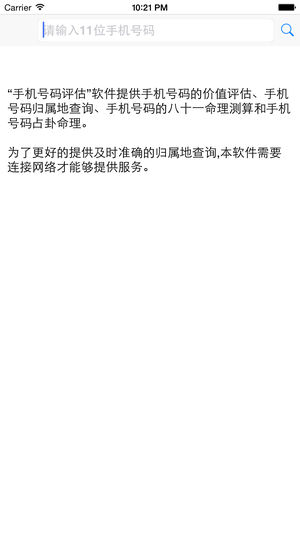 主要提供手机号码的价值评估功能,可以对号码根据吉祥号、地区号、生日号、日期号、重号和叠号等规则进行分析。 本软件还提供归属地查询,并能够根据手机号码对机主进行个性分析和八一格算命。 评估结果可以通过短信和邮件进行分享,并提供复制功能和机主号码的所在地查询。 为了更好的提供及时准确的归属地查询,本软件需要连接网络才能够提供服务。