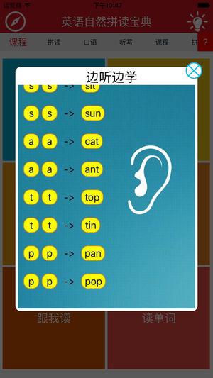 Appstore排名第一的英语拼读应用,教你如何用英语拼读法来快速记忆400个单词,不再死记硬背,是记忆单词的最佳方法。 本软件是学习自然拼读法(Phonics)的最佳应用, 结合多年教育经验精心设计, 让广大学生无需参加昂贵的学习班, 就可以轻松掌握自然拼读法, 可以达到无需音标、无需死记硬背、见词能读、听音能写。 英语自然拼读宝典——把英语教学中的视、听、说紧密结合, 循序渐进地培养孩子的语音感知和运用能力。纯正发音领读, 让孩子从小感受地道英语发音, 从此孩子和枯燥的音标学习说bye-bye!, 本应用将成为孩子贴身的一对一家教辅导, 使一年级以上已经学习过中文拼音的学生只要稍加学习即可…