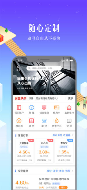 民生手机银行是专门为智能手机和移动终端客户量身打造的移动金融服务平台,其中“首页”频道拥有转账汇款、投资理财、信用卡、小微银行、直销银行等丰富的金融服务, widget小应用支持随心定制,使用更加便捷;“生活圈”频道拥有话费充值、生活缴费、飞机票、火车票、游戏点卡、欢乐民生购、限时抢购、出国金融、汽车金融、好房金融、手机服务等丰富的生活服务;“财富”频道聚合投资理财服务,应用大数据和人工智能技术向您推荐理财、基金、保险、外汇等金融产品,资讯信息应用尽有。“我”频道为您全方位展示资产信息,提供个人信息摘要、资产透视、月度对账单、收支明细以及智能的金融日历、消息等贴心服务。 时尚动感的界面视觉、个…