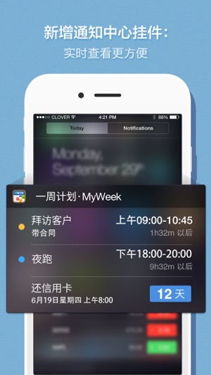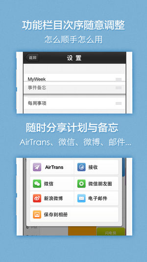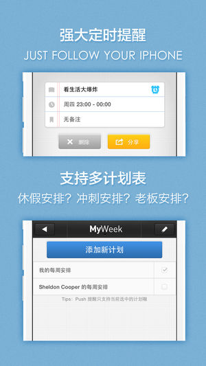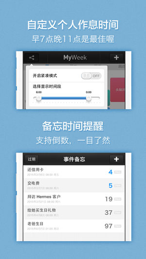 「MyWeek·一周计划」是一个帮助你计划每周时间安排的超精致应用,每周五晚上看 Big Bang? 周二看电影? 周日打星际II? 周末 Diablo III 之夜? 一切就和你最熟悉的时间表一样简单,方便。支持提醒,还有超级便捷的事项倒数日备忘功能。 =特别亮点 · Special Feature= 1.「每周计划一览」简单直观,Now 标记时间坐标,摇一摇有惊喜 2.「事件备忘提醒」和客户开会?买生日礼物?还信用卡?倒数日备忘一目了然 3.「强大定时提醒」每日提醒,每事件提醒 4.「支持多计划表」休假安排?冲刺安排?女友时间安排? 5.「通知中心挂件」方便地查阅近期事项与备忘 6.「人…