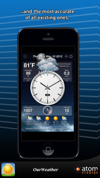 *** Featured by Apple as 'What's Hot' *** OurWeather for Mac is also available on the Mac AppStore! Welcome to OurWeather Do you want to know the weather forecast without having to look out the window? Do you want to have the most accurate and complete weather on the palm of your hand? With OurWeather now is possible! We have done for you what is probably the most beautiful weather app, and what is best, this is perhaps the most accurate of all existing ones. Other apps are focused on having lots of functions and settings. We thought it will be better to have an app that gives you everything with a single screen tap. Forget about configuring lots of settings. With OurWeather you will have everything you need in a simple and natural fashion. TECHNICAL FEATURES - Super accurate weather forecast - High quality graphics compatible with iPhone Retina and iPad Retina - High quality animated backgrounds (over 40) to give you an accurate and dynamic weather forecast visual feedback - Nothing to configure. OurWeather finds your position using GPS and gives you the weather where you are - Shows up to 10 different cities - Swipe your finger to change cities DATA DISPLAY - Current Date - Temperature (ºC or ºF) - Relative Humidity - Weather Forecast for Today - Rainfall in mm - Wind Speed - Percentage of Cloud Cover - Pressure in mbar - Visibility (kilometers or miles) - Forecast for the next 5 days with maximum and minimum temperatures - City Name SUPPORT Do you have some trouble? Do you need help? Do you have a awesome idea for this app? Please contact us. We are here to help! support@atomstudios.es www.atomstudios.es http://twitter.com/#!/Atom_Studios http://www.facebook.com/AtomStudios NOTES PLEASE NOTE: For using this app, you must have a GPS and compass equipped device, such as an iPhone 3GS or an iPhone 4. This application is NOT RECOMMENDED FOR IPOD TOUCH, NON-3G IPAD OR 1ST GENERATION IPHONE devices due to their limited hardware capabilities.