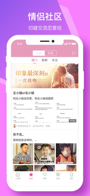 -专为2亿情侣打造 -荣登湖南卫视金鹰节潮互联网社交榜 -荣获年度金瑞奖--创新奖 -荣获年度超受女性喜爱APP -荣获年度极具潜力移动社交类应用奖 小恩爱是为情侣量身定制的私密应用,为你们提供了私密互动空间、情侣社区、情侣游戏、情侣消费指南等情侣专属服务。 功能简介 【私密互动工具】 私密聊天:记录爱的点滴,只有情侣彼此能看到; 远程闹钟:让TA一键叫你起床; 纪念日:再也不会忘记各种属于你们的日子啦; 小姨妈:马上知道女友来那个了; 发送距离:每一次距离的发送,都承载着重逢的渴望; 日记本:可以共享的爱情日记; 私密相册:用照片记录下你们的美好瞬间; 【情侣社区】 社区达人:关注达人…