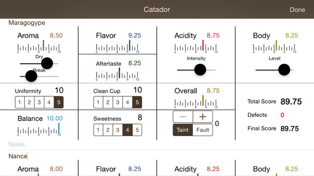 Catador replicates the industry standard SCAA coffee cupping scoresheet with an easy-to-use system of sliders to rate sensory criteria and tick boxes to mark off-cups in the categories of Uniformity, Clean Cup and Sweetness. Touching the Notes line launches a virtual keyboard so that you can recor…