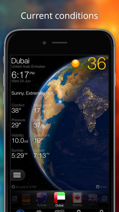 Amazingly beautiful 3D images of our planet draws your attention for so long that you may forget that the application has other useful features that allows you easy access to precise, global weather information. Features: • Easily select different cities using the city carousel with national flags • Chic 3D “home screen” with high-quality real-time image of the earth, atmosphere, the stars and the sun • 15-day forecast chart with detailed daily weather conditions, independent day and night temperature charts • 48-hour hourly forecast with detailed information with real-time changing of chart step • Database of 80 000 cities with weather information, quick look-up and automatic detection of location • Temperature on the icon badge • Customized Weather Widget • Weather Maps The main features of “Weather Now” are the “home screen” and the forecast page with a unique way of scaling the charts. On the “home screen”, you can get information on the selected location such as local time and current weather with detailed weather conditions, and, of course, an incredibly beautiful three-dimensional image of the globe with realistic-looking atmosphere, the sun and the stars. You can manually turn it, increase and decrease its size, run the slow spinning animation or stop it. Installed in a cradle or dock station, the application can run as a screensaver, attracting your friends and fellows. The weather forecast is provided by CustomWeather, Inc, an American weather provider of global weather information for over 11 years. CustomWeather is a leader in technology and meteorological innovation, providing local weather information to companies and application developers around the world. The current weather data is gathered from thousands of professionally installed and maintained weather stations installed mostly at airports. WeatherNow only shows current weather from stations that have reported local weather conditions within the past hour. Current weather data is refreshed every 30 minutes; that is twice as frequent as most other weather providers can offer. Unique 48-hour forecasts from over 80,000 locations around the world provide a level of coverage and detail that simply cannot be found elsewhere. Current weather information includes: description, air temperature, wind direction and force, humidity, dew point, pressure, visibility, as well as comfort index with reference to current weather conditions. Detailed weather forecast information includes: description, day and night air temperature, wind direction and force, humidity, UV index, probability of precipitation, and comfort index with reference to current weather conditions. Weather Now ° is free to download and use. Purchasing the Premium upgrades your experience and gives you access to more features the Beginner a 3 months, the Advanced a 6 months or the Weather Pro a year through an auto-renewing subscription. The Premium Subscription unlocks temperature on the icon, weather notifications and reports, weather maps layers, extended city list, extended weather widget, ads free version and premium support. Subscriptions will be charged to your iTunes Account at confirmation of purchase. Your subscription will automatically renew unless cancelled at least 24 hours before the end of the current period. You will not be able to cancel a subscription during the active period. You can manage your subscriptions in the Account Settings after purchase. Our Privacy Policy: http://weathernowapp.com/privacy.html Our Terms of Use: http://weathernowapp.com/terms-of-use.html