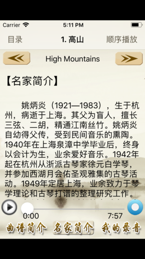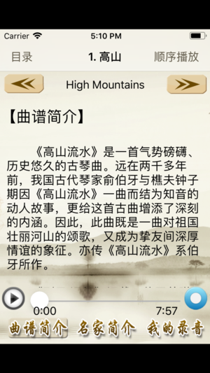 古琴是我国古老的弹拨乐器之一,蕴含着丰富而深刻的文化内涵,几千年来一直为文人雅士所喜好。 产品内容由古琴简介、古琴文化、名曲欣赏、教学视频、录音保存等多部分构成。支持简体中文和繁体中文,曲目有对应英译。 古琴简介介绍了古琴基本知识及弹奏技法;古琴文化包含古琴的构造与特点、古琴音韵、名琴典故、古琴流派等相关知识;名曲欣赏精选了姚炳炎、吴景略、吕宏望、管平湖、张子谦等多位名家演奏曲目,产品还配有琴曲意境的精美图片及曲谱简介;教学视频提供了古琴基本技法教程;录音保存便于读者播放录音文件。 《古琴赏学》产品,遴选了以下54首古琴名曲。 高山(High Mountai…