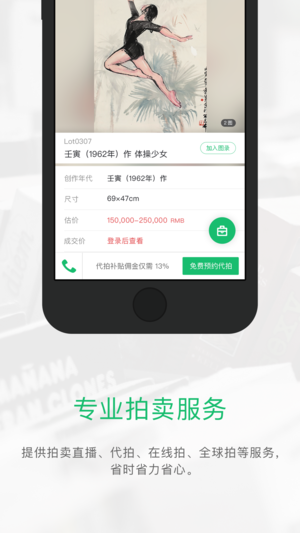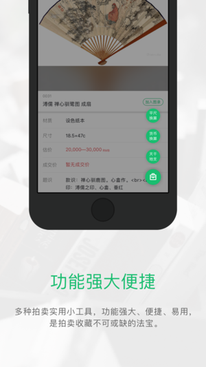 雅昌拍卖图录是中国拍卖行业协会、中国收藏家协会、《中国收藏拍卖年鉴》等联合推荐产品。 雅昌拍卖图录是雅昌集团致力于为拍卖界及广大收藏爱好者、研究者提供高品质服务而全力打造的拍卖界专业工具。其集合了拍卖业1993年至今二十多年的数据,提供拍卖直播、代拍、在线拍、全球拍等服务,具有拍卖数据的多维度查询、我的图录、常用换算工具、拍品高清大图、拍品备注、成交价提醒、地图导航...等众多功能,真正成为集艺术鉴赏、辅助决策、收藏投资于一身的拍卖专业工具。 「海量拍卖数据」:雅昌拍卖图录汇集了1993年来24,000多场、630多万件海内外拍品、1000多家拍卖机构数据,并持续更新。雅昌拍卖图录的拍品多图…