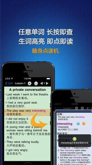 《新概念英语》(New Concept English)作为享誉全球的最为经典地道的英语教材,以其严密的体系性、严谨的科学性,精湛的实用性,浓郁的趣味性深受英语学习者的青睐,《新概念英语》在中国有40多年的历史,每年有数百万学习者,早已成为英语学习者的必选读物。 √√标准发音+英汉对照+有声全文字典+点读机 《新概念英语》的每个句子都有标准的真人读音, 英汉对照, 即点即读. 文中每个英文单词都有详细的解释, 音标, 发音以及例句用法, 在阅读的时候只需在任意单词上长按超过一秒钟, 即可查阅, 即点即译, 真正做到哪里不懂点哪里. √√强大的学习功能 《新概念英语》提供了【生词】【收藏】【…