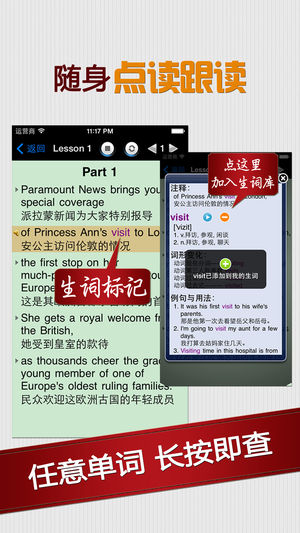 《罗马假日》的每个句子都有标准的真人发音, 英汉对照. 每个英文单词都有详细的解释, 音标, 发音以及例句用法等, 在阅读的时候只需轻轻一按, 即可查阅. 《罗马假日》有多种播放模式: 单句, 单句循环, 全文, 全文循环, 全书循环, 支持后台播放, 可切换英汉对照模式与纯英文模式. 新增语速调节功能, 三种语速, 任意调节.