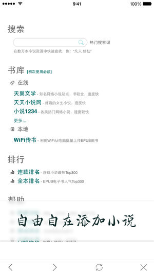【100%免费追书利器,书全更新快,支持离线】 【累计46000份5星好评,9成用户安装后长期使用】 【默认大字体,柔和背景色 = 用心呵护您的眼睛】 核心功能: • 海量小说资源聚合/全面移动阅读优化 • 最新章节同步更新/自动预载离线阅读 • 一键换源/智能搜索/热榜排名/关联推荐 • 书签分类/云同步/WiFi传书/省流量模式 -- 九成以上用户五星好评! -- “书全,更新快”,“好,用这个已经看完几本书了“,“挺好的一个看小说利器”,“品种齐全啊!支持了!希望以后能越做越好!”,“软件挺给力的!翻页也很方便!就是能改页面设置就好了!”,“真心不错,用起来方便,又没有网页弹屏广告…