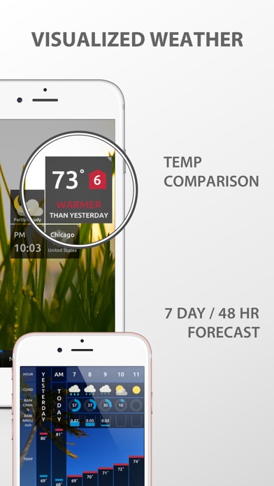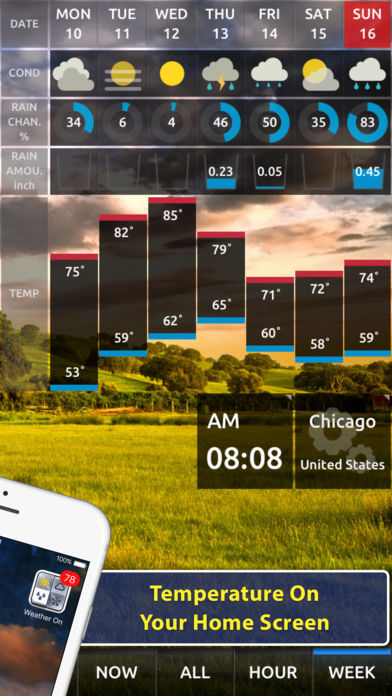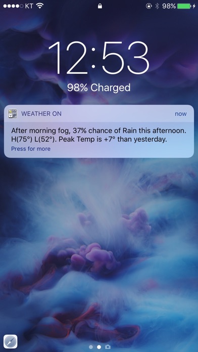 Is it possible to expect the weather without opening the app on your iPhone? VISUALIZED, FAST, BEAUTIFUL, EASY and SIMPLE Weather On Offers Daily Push Notifications On the Time You've set. This is the Key Feature for Weather On that Makes it So Special. Experience the Different Level Right Now. Watch the Video https://vimeo.com/51734242 Visit our Homepage https://weatheron.fantaon.com ■ Features: 1. Weather Forecast Push Notification Service - Today or Tomorrow's Weather Forecast - Everyday at The Time You Set - Unlimited Notification 2. Current Temperature as An Icon Badge on Your Home Screen - Fahrenheit / Celsius - Hourly Update 3. Animated and Visualized Weather Condition - Easy to Recognize Detailed Weather Information 4. Temperature Comparison Graph - Comparison Between Yesterday & Today’s Temperature - Easier View 5. Loading in Rapid Speed - Different Loading Speed from Other Thousands of Apps 6. 19 Beautiful Wallpapers (Premium) - High Resolution Photos for Retina - 2 Wallpapers for Free Version 7. Downloadable Wallpapers for Home Screen (Premium) - All Wallpapers Available to Download 8. 400+ Inspirational Quotes - Offers Inspirational Quotes while Loading 9. Forecast for Over 75,000 Locations Around The World - Provided by CustomWeather Inc. - Technical Provider Of Global Weather Information for Over 15 Years 10. 48-Hour Detailed Forecasts - Hour-by-Hour Forecast - Conditions - Precipitation Probability - Precipitation Amounts - Temperature Graph - Comparison Between Yesterday & Today’s Temperature 11. 7-day Forecast - Conditions - Precipitation Probability - Precipitation Amounts - Temperature Graph 12. Current Condition Report - Current Condition descriptions - Current & Max/Min Temperature - Comparison between Yesterday & Today’s Temperature - Feel Like Temperature - UV Level - Wind Speed/Direction - Humidity - Visibility - Sunrise/Sunset & Moonrise/Moonset Time - Dew Point - Pressure 13. All in One Forecast View - Current Condition - Today’s Forecast - Tomorrow’s Forecast - 7-Day Forecast (2-Day for Free Version) 14. Fast & Reliable 24hr Stable Services. - Using Amazon Server to Offer Fast & Reliable 24hr Stable Services. 15. Easy Purchase Premium via In-App Purchase - Don't Need To Download a Seperate App for Premium 16. Customizable Default Menu - Quick Approach to Frequent View Page