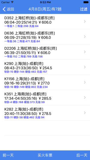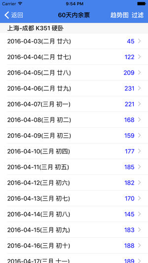 查火车票是一款火车票详细信息的查询工具软件,它可以让您在规划乘坐火车出行方案时提供更多购票决策信息。它是《买火车票》的姊妹篇,可配合使用。 [软件特点] 1.余票趋势提供一个发到站区间里,一段时间的余票数量信息的功能,可以让您了解最多60天里某一次车、某个席别车票的余票数量分布情况。 2.可以查询同一车次代码,而不同发到站的车次;也可查询同一趟车,不同车站有多种车次命名的车次。 3.车站和车次可级联查询。 4.提供火车站、代售点的地址位置、问询电话等信息。 [常见问题] Q:我查到了车票信息,能否通过手机购票呢? A:您若需要通过移动设备购票,请使用我们的另外一个叫《买火车票》软件。 Q:…