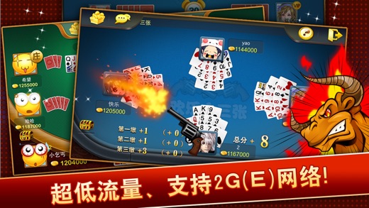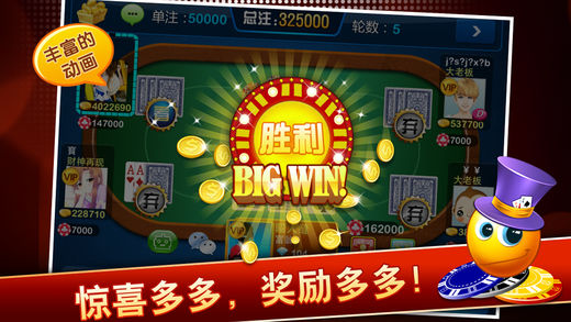 “嗨,亚历山大吗?快来玩大富豪系列游戏吧,把压力和烦恼通通炸飞。iOS上减压利器《欢乐联网大富豪》,将带给您无比舒畅的好心情。心情好,就会一切顺。” @1. 每天登录送金币,连续登录一天更比一天多。 @2. 每日尾号中大奖,圆您一个500万大奖的梦。 @3. 无金币玩家每90分钟获得一次救济金(8000金币)。 @4. 有机会获得能每天给您吐金币的金猪。 @5. 丰富的游戏玩法,百玩不腻,一款在手,整日无忧。 我们崇尚学习和创新,不会去山寨和模仿。我们孜孜不倦,只求会像苹果一样铸就经典。作为资深苹果人的您,我想您也会和我们一样的鄙视山寨,崇尚原创。 内含多种广泛流传的扑克游戏, 简单有趣, 上手快, 娱乐性强, 受到广大扑克爱好者的亲睐。只需要您将设备与互联网相连接, 不论您是不了解基础知识的新手, 还是资深的高手, 都能够轻松的加入适合的牌桌尽情的游戏。, 欢乐联网大富豪游戏,也是成功人士、明星大碗、圣男圣女等的集散中心,不断完善的社交功能,让您打牌之余还能收获更多。说不定哪天您会发现,您心中无比庄严的偶像原来正死皮赖脸地找您搭讪呢。 游戏特色: @ 免费下载:免费下载即可获得游戏中的所有体验,并且每天还有登陆大奖等您来拿哦。 @ 超低的手机流量:支持各种网络接入方式,优先检测并接入WIFI网络。同时优化网络链接,使手机流量更低。 @ 稳定流畅:全面优化确保游戏运行稳定,确保最流畅的游戏体验。 @ 良好的用户体验:专为iPhone/iPad/用户量身制作,精美的界面,流畅的效果,不亚于PC的用户体验。 @ 有趣的人声聊天:不论您发送的是文字还是表情,我们都会用有趣的语言“说”出来,让您在欢乐中体验游戏的每一刻。 @ 游戏聊天,不用打字啦,支持语音聊天,声情并茂,趣味多多。 -----------服务器已采用多线接入方式------------ 不管您是电信、网通、长宽接入用户,还是移动等接入用户,都可以享受流畅的游戏效果。 注意:如运行时仍有卡的问题,请注意检查手机wifi或gprs信号强弱。如是家庭wifi上网用户,手机和无线路由器距离不要太远,以免信号太弱。 欢乐联网大富豪是在普通炸金花规则的基础上加以改进, 演变出的一种更为有趣, 更为刺激的炸金花模式。游戏可以由2-5人同时进行, 使用一副扑克牌, 在去掉大小王的同时, 也去掉了2、3、4、5、6, 一共是32张牌。, 牌型说明: 豹子:三张点相同的牌,如999、AAA。 顺金:花色相同的顺子,如黑桃789、红桃QKA。 金花:花色相同,非顺子,如黑桃89J,方片AJ8。 顺子:花色不同的顺子,如黑桃8红桃9方片10。 对子:两张点相同的牌,如99J,AA8。 散牌:三张牌不组成任何类型的牌。 大小规则: 1. 豹子>顺金>金花>顺子>对子>散牌。 2.牌点中,7为最小,A为最大。从大到小依次为:A、K、Q、J、10、9、8、7。 3. 同种牌型,顺序比点,大小若相同,开牌者输。 4. 逆时针开牌,相同牌,先开者输。 发牌规则: 由赢家开始发牌,每人三张,玩家初始牌均暗牌。 确定庄家:首次随机抽选庄家,以后顺时针轮庄。 名词解释: 底金:第一把每位投入的初始注,论级别不同而不同。 投注额:每次投注的金额。 封顶:每局个人最高可投注额的上限 明注:玩家看牌,看牌后下注是暗牌一倍。 跟注:和上家加入同样多的注。 加注:在上家投入的基础上增加投入注。 放弃:玩家自动弃权,放弃已投注的所有筹码,判输。 喜金:获胜方如是金花以上大牌,且跟过暗注,则其他玩家需额外支付金币。 放弃规则: 游戏操作超时为放弃,丧失已经下注的所有筹码。 胜负判定: 按照牌型大小比较,牌型大者获胜。 各位玩家朋友:适度游戏才有利身心健康,切勿沉迷! 如果我们的游戏能给您带来欢乐,那将是我们最大的荣耀!祝您快乐,祝您天天好心情! 请把问题告诉我们,请把欢乐传递给您的朋友! 有任何疑问,请联系我们: QQ1:892105919 QQ2:593991452 QQ3:2388498759