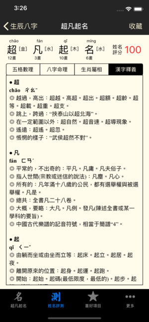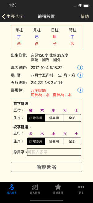 算法更新,优化推荐结果,更多选择。更正部分字体错误,请升级至最高版本获得完整体验。 在iPhone基础上进一步支持iPad mini,iPad1、2以及带Retina显示屏的新一代iPad。加量不加价!超值选择,专业选择! 请升级至IOS10.0以后的版本获得最佳效果,其他版本如有问题,请及时联系我们。 超凡起名提供一键智能起名,免去您翻阅字典之苦。精选汉字字库,完整汉字解释,让您选出字型音义俱佳的超凡好名字。 如果您同时是传统八字理论的拥趸,通过我们专业的生辰八字命理分析,您可以在精选字库的基础上获得更精确的过滤指导。除此之外,我们还综合了姓名学中的三才五格数理分析,生肖属相…